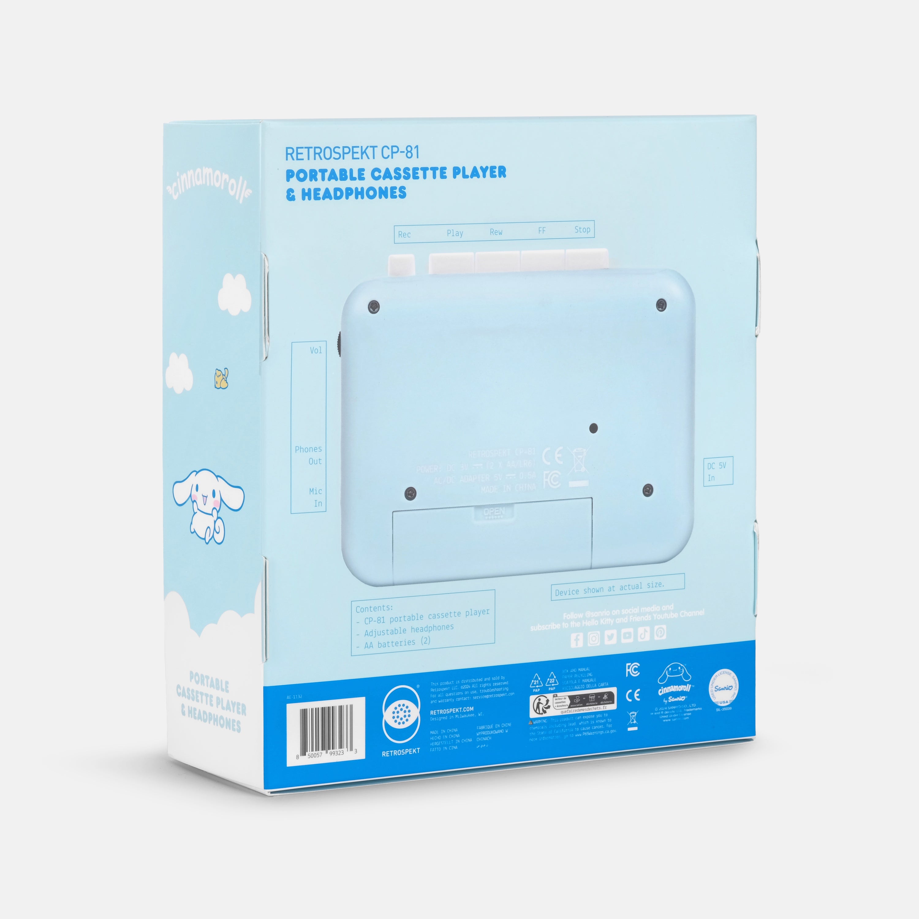 Created by Retrospekt and Sanrio exclusively for their newest collection of retro tech products, the CP-81 from Retrospekt is a completely new portable cassette player offering a classic cassette tape experience with all the core cassette player functions. The player comes packaged with exclusive Cinnamoroll headphones featuring an adjustable headband and blue foam cushions.