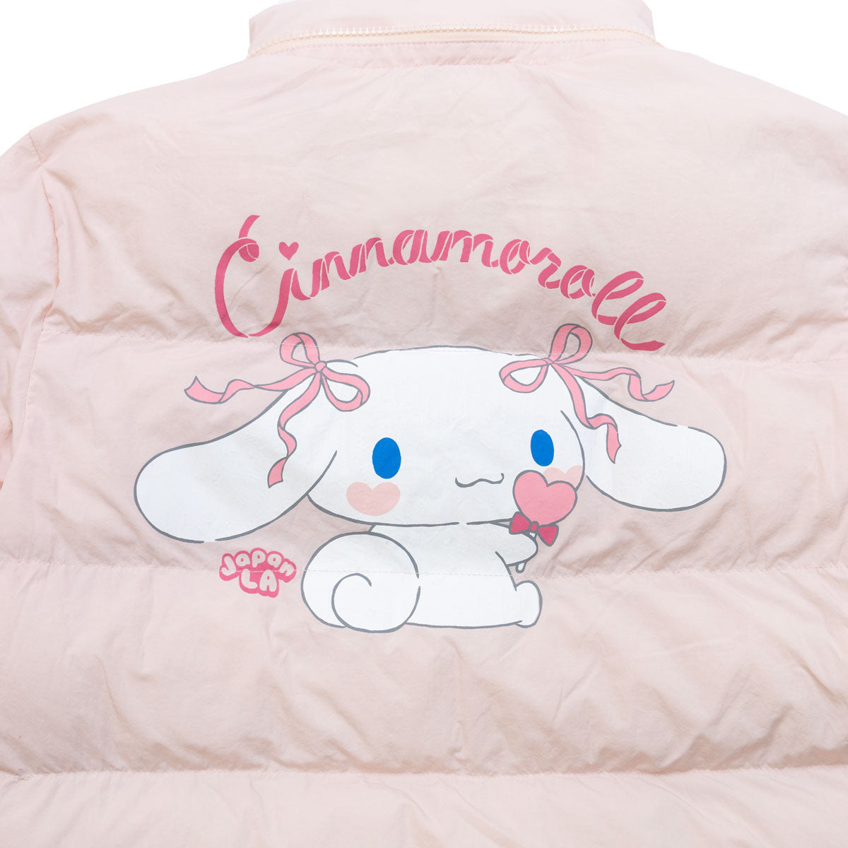 A special collaboration piece between JapanLA and Sanrio. Stay warm and cute in our light pink Cinnamoroll Bows Puffer Jacket from JapanLA! Features an adorable print of Cinnamoroll wearing pink bows on the front and back, with secure snap buttons, a zipper, and a removable hood for convenience.
