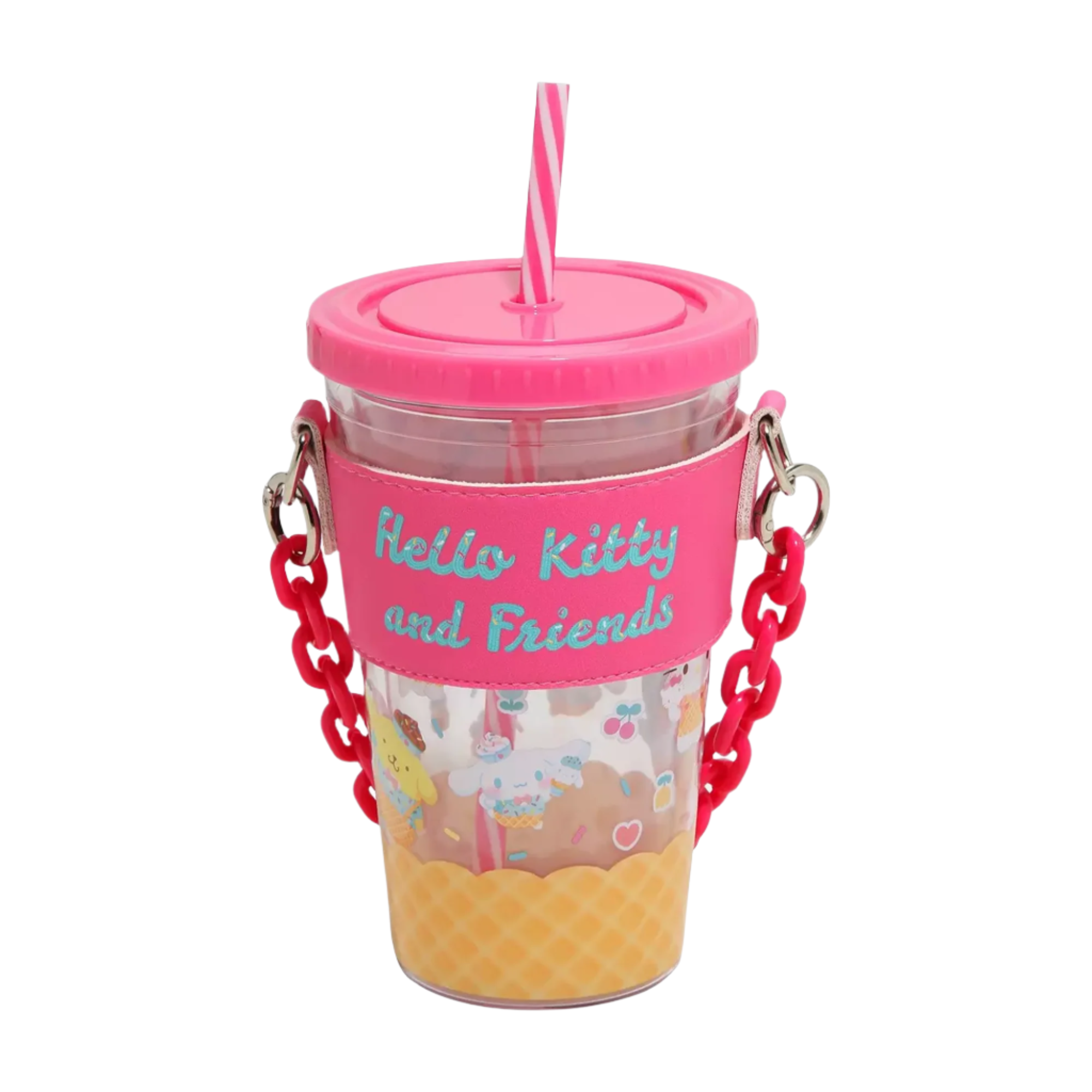 Stay hydrated while Hello Kitty and Friends keep you company! This kawaii travel tumbler comes with a reusable straw, and removable carrying chain while featuring your favorite Sanrio characters in an adorable ice cream motif.