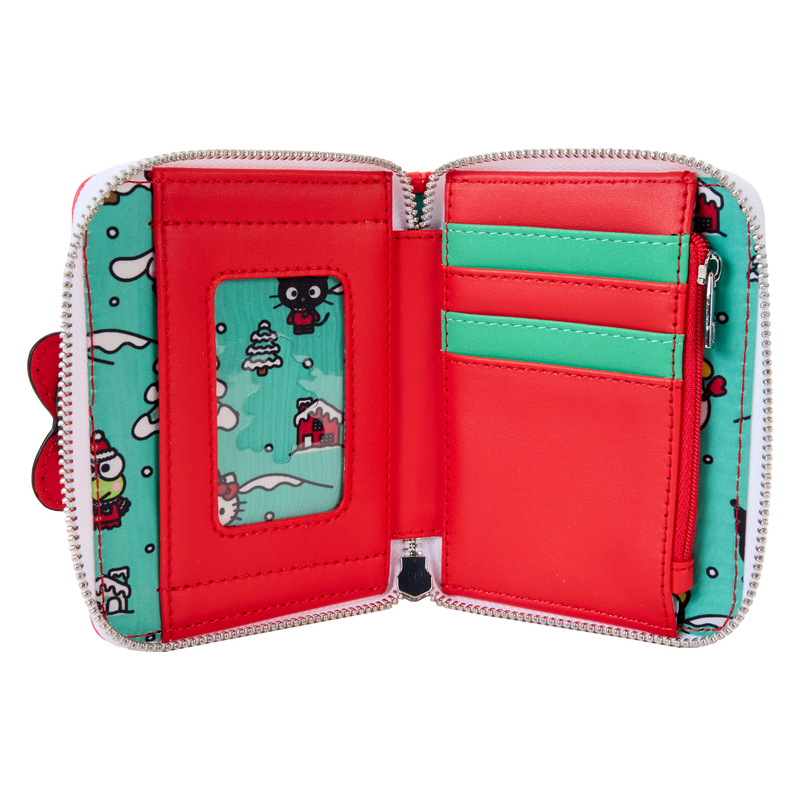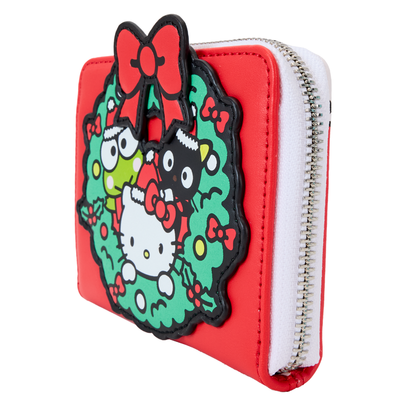 Hello, holidays! Welcome Hello Kitty and Friends to all your festive fun. Take along this zip-around wallet and share smiles wherever you go. Hello Kitty’s adorable face peeks out from the middle of an applique wreath—and she’s accompanied by a few friends. On the back, they make an encore appearance, all decked out in super cute sweaters and outfits.