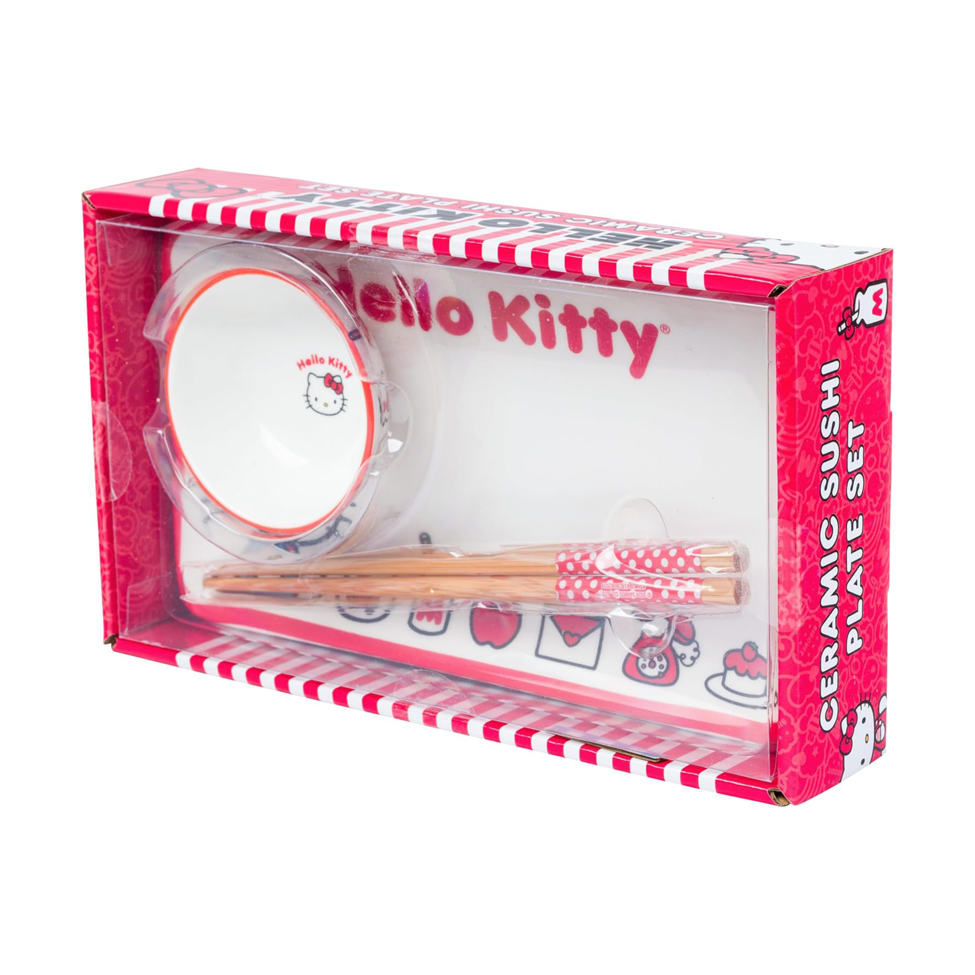 Enjoy sushi with a side of cuteness with this adorable Hello Kitty Sushi Set! This three-piece set features a sushi plate, soy sauce dish, and chopsticks adorned with Hello Kitty sitting alongside her favorite things. Made from durable ceramic, the plate and sauce dish are perfect for sushi nights, snacks, or simply adding a touch of Hello Kitty to your table!