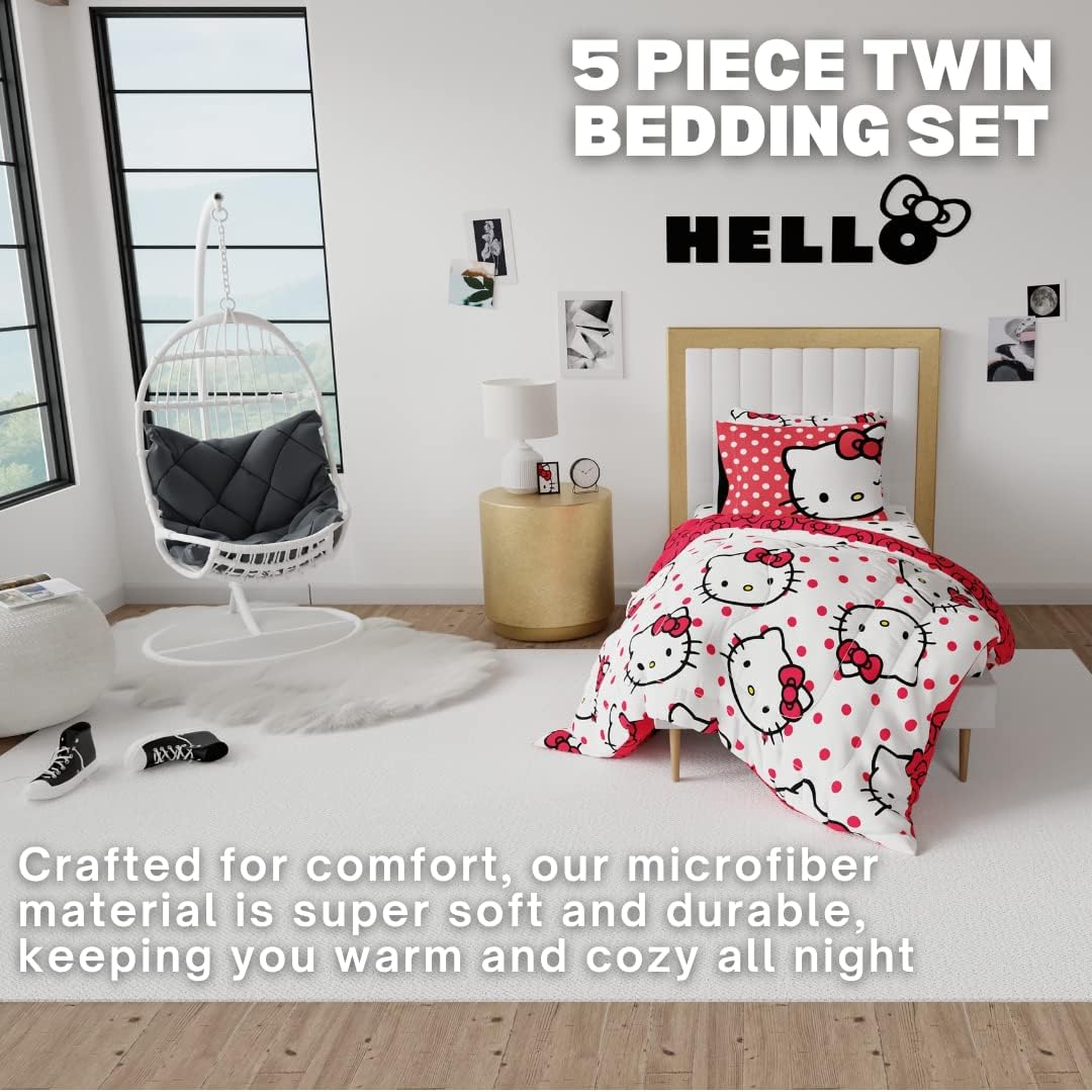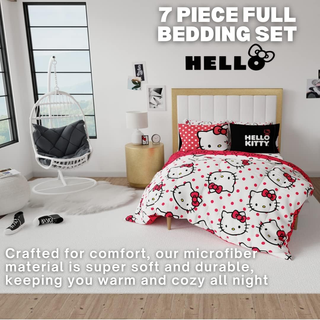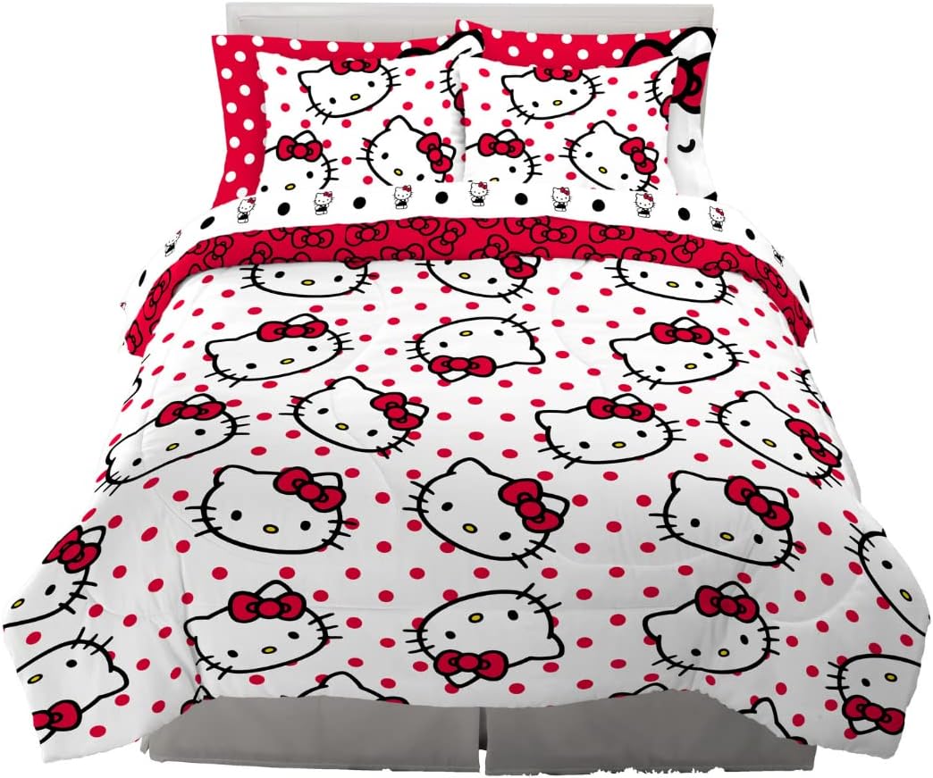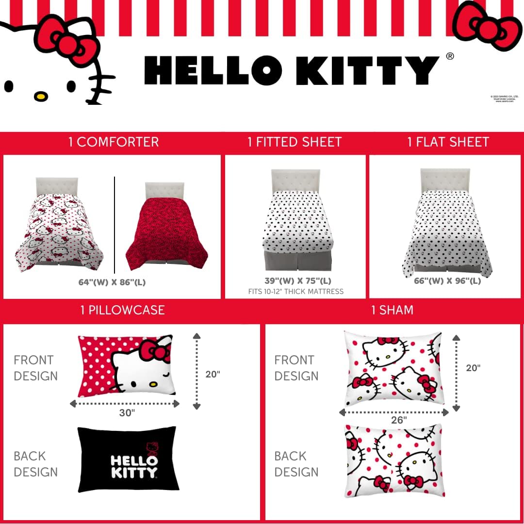 One can never have too much Hello Kitty in your life! This bedding set is a must-have for any collector or fan. The reversible comforter features two unique designs – one side has a white background with polka dots and classic Hello Kitty graphics, while the reverse features an all-over print of Hello Kitty’s instantly recognizable bow against a bold red background.