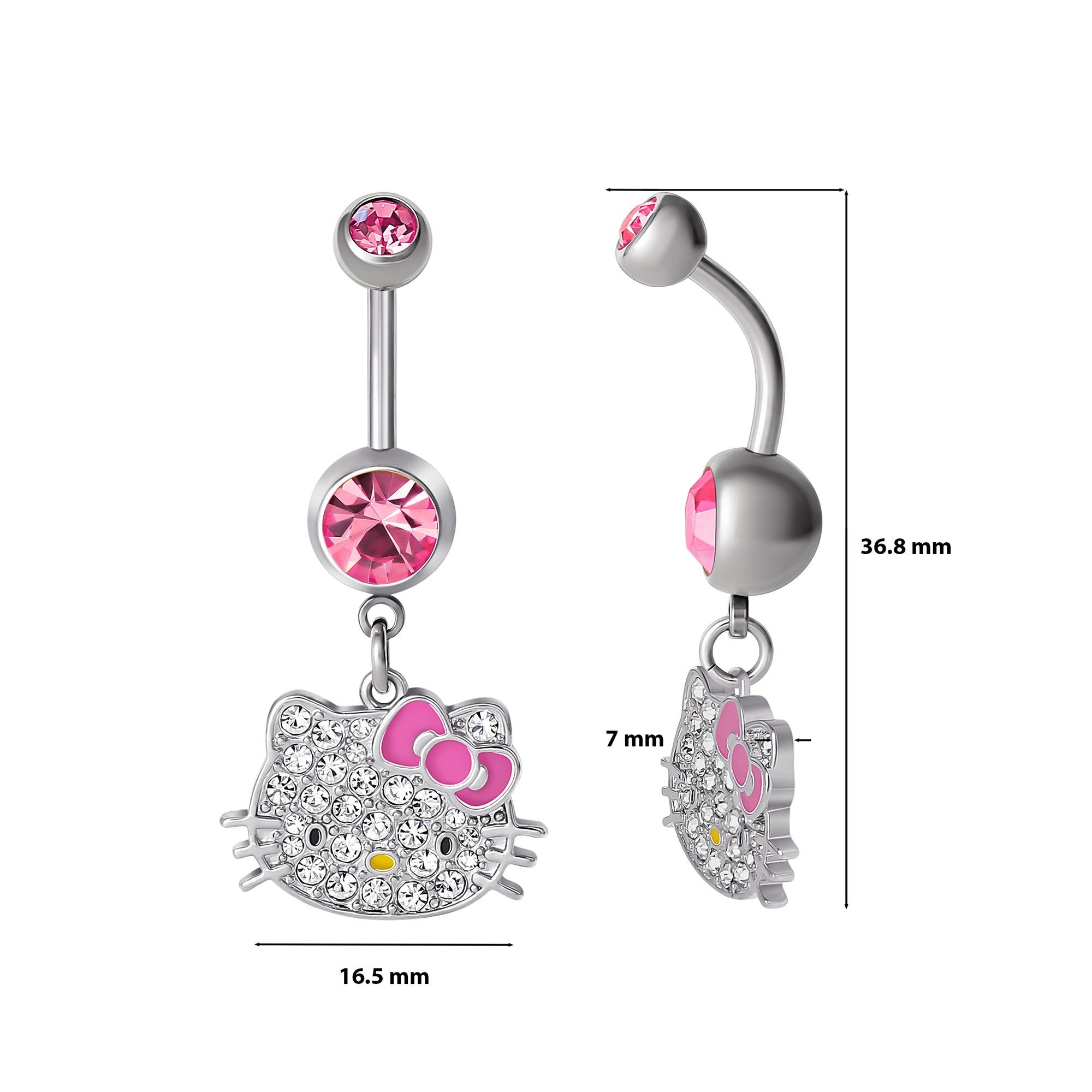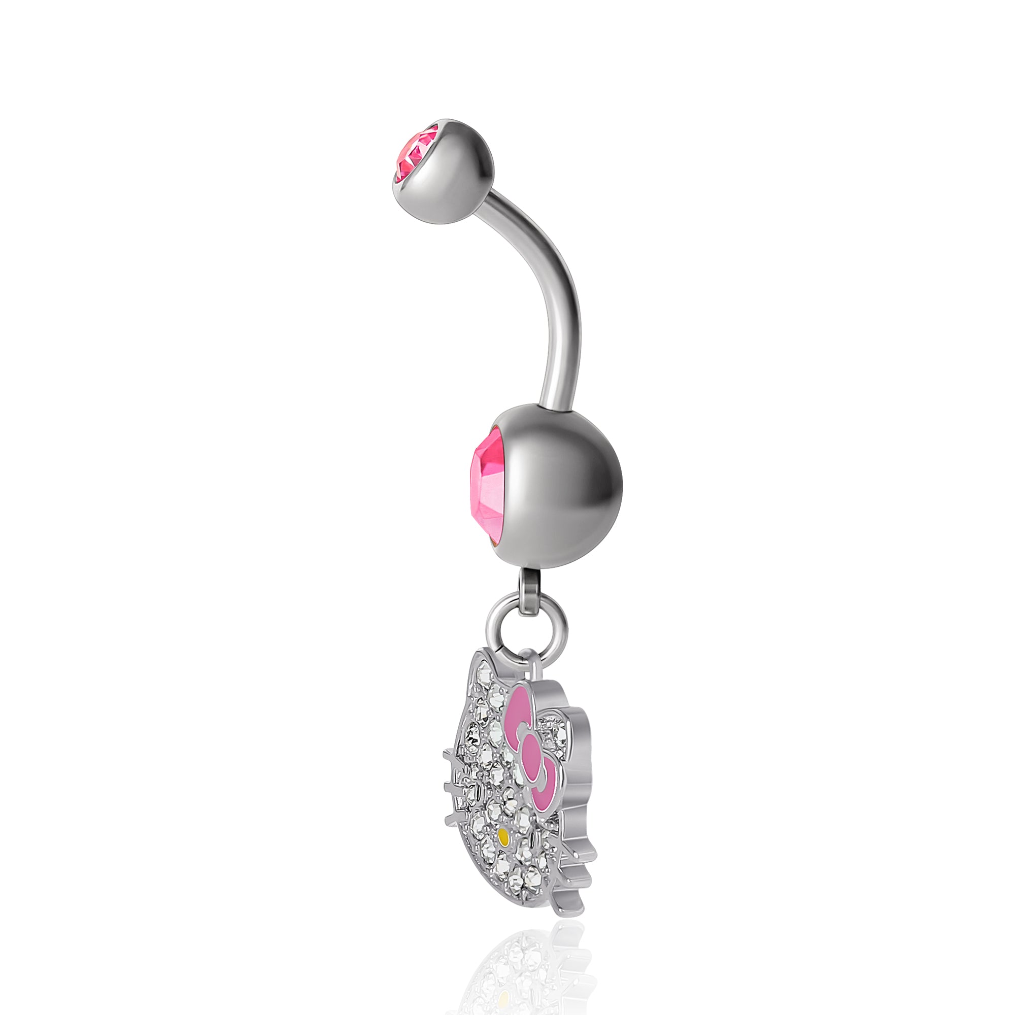 Flaunt your Hello Kitty spirit with this cute belly bar! Adorned with glowing stones alongside a dangling enamel Hello Kitty charm, it’s the ultimate summer body jewelry pick.