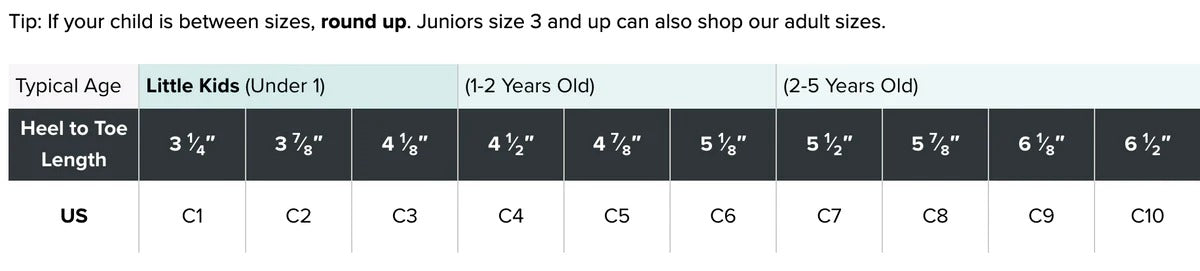 *Tip: If your child is between sizes, round up. Please see size chart included with our product photos for reference