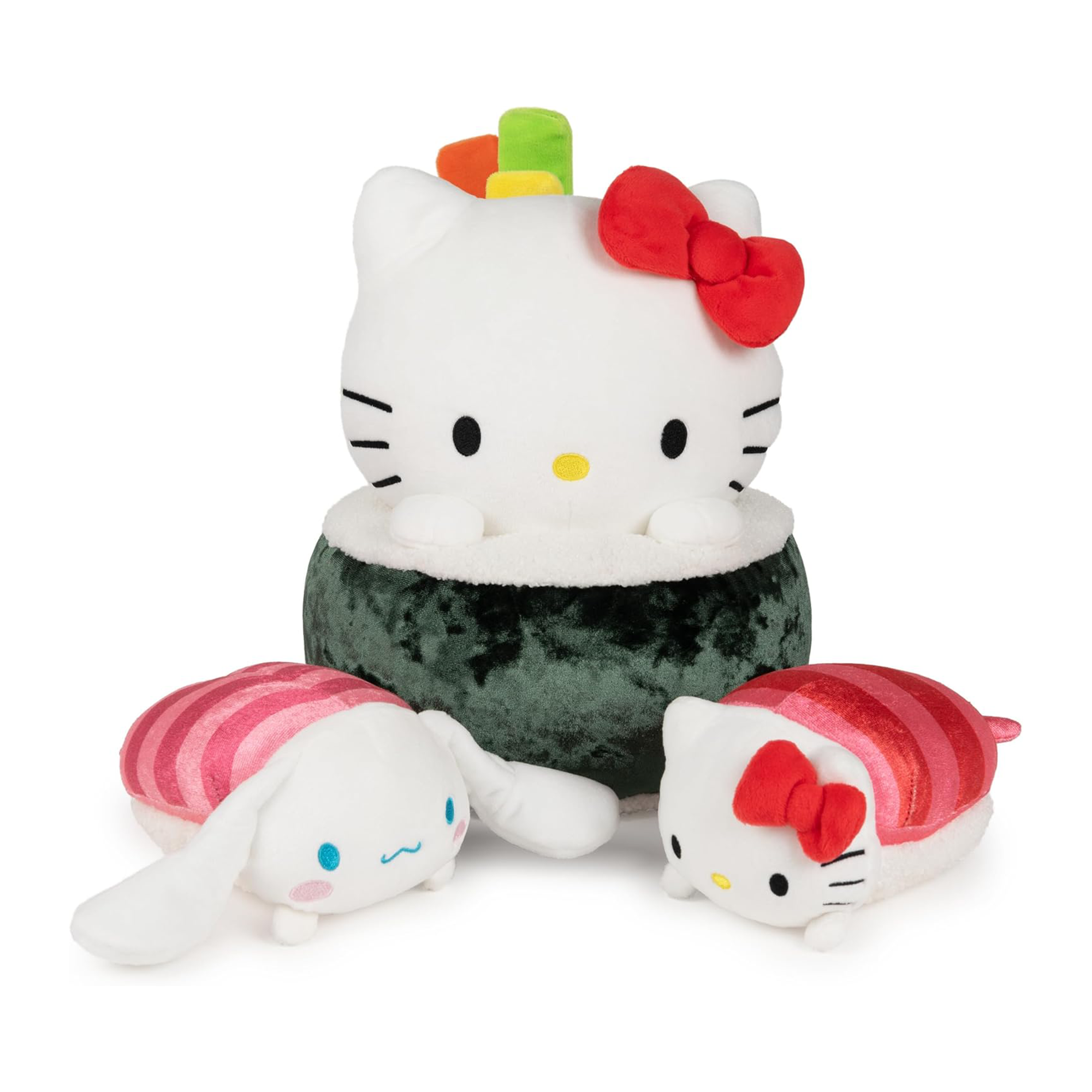 Hello Kitty is a classic Japanese delicacy! This whimsical 10” plush features Hello Kitty as a large piece of sushi with embroidered facial details and several bright veggie sticks tucked behind her head. She sports her signature red bow and sits comfortably on a bed of fluffy white rice, which is wrapped in a dark green piece of crushed-velvet nori.