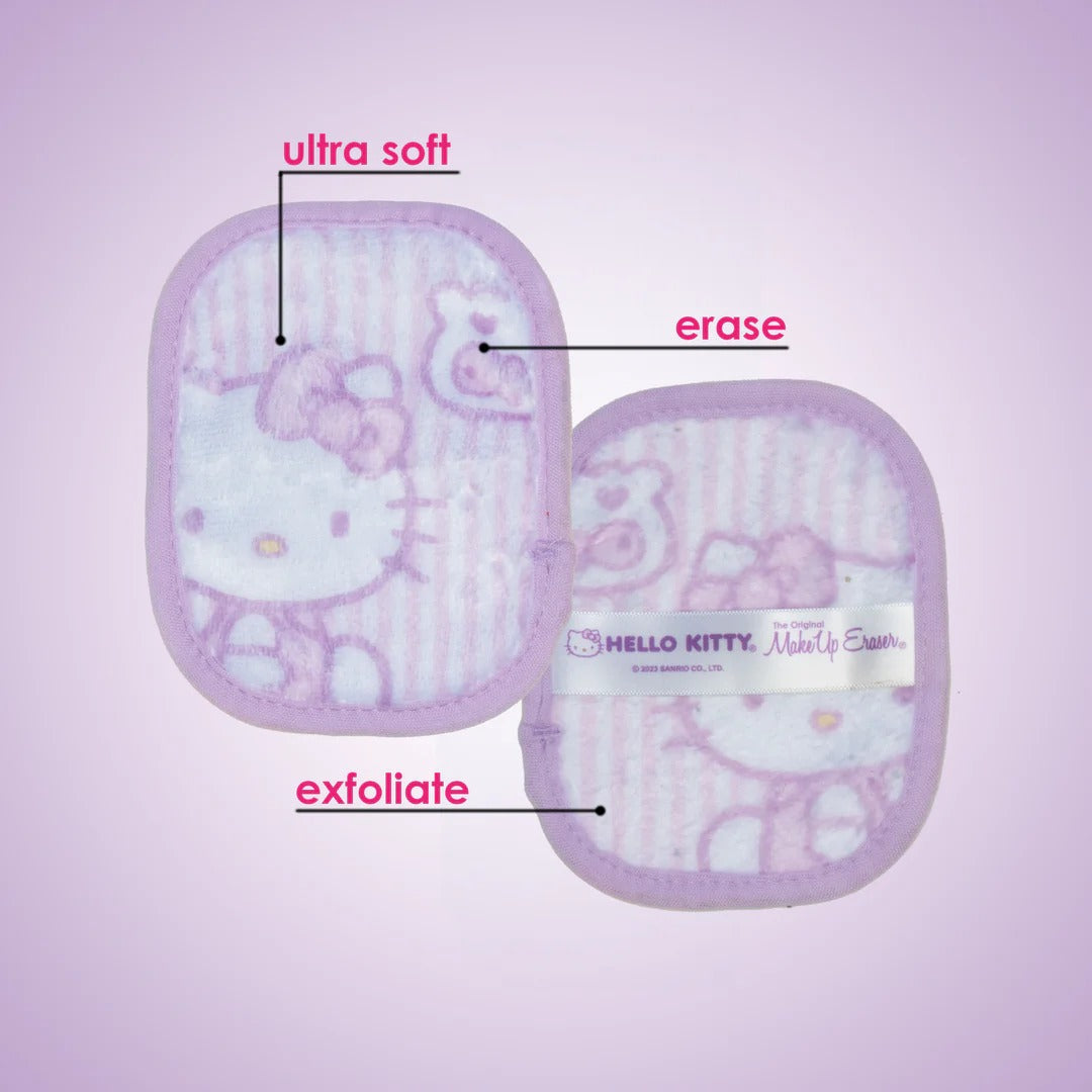 Let’s get squeaky clean with Hello Kitty! Erase all makeup with just water! Including waterproof mascara, eyeliner, foundation, lipstick, & more! Double-sided to erase makeup with the short fiber side & exfoliate the skin with the long fiber side (side with tag).