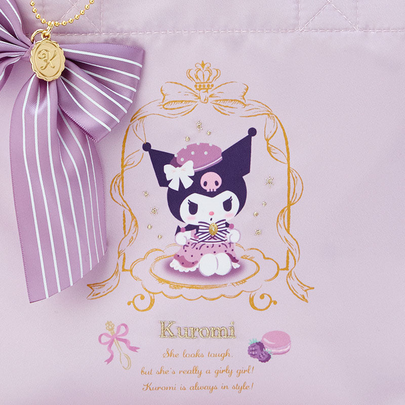 With stripped ribbon accents, gold charms and a printed interior lining, this delightful handbag holds all of your special items for afternoon tea.