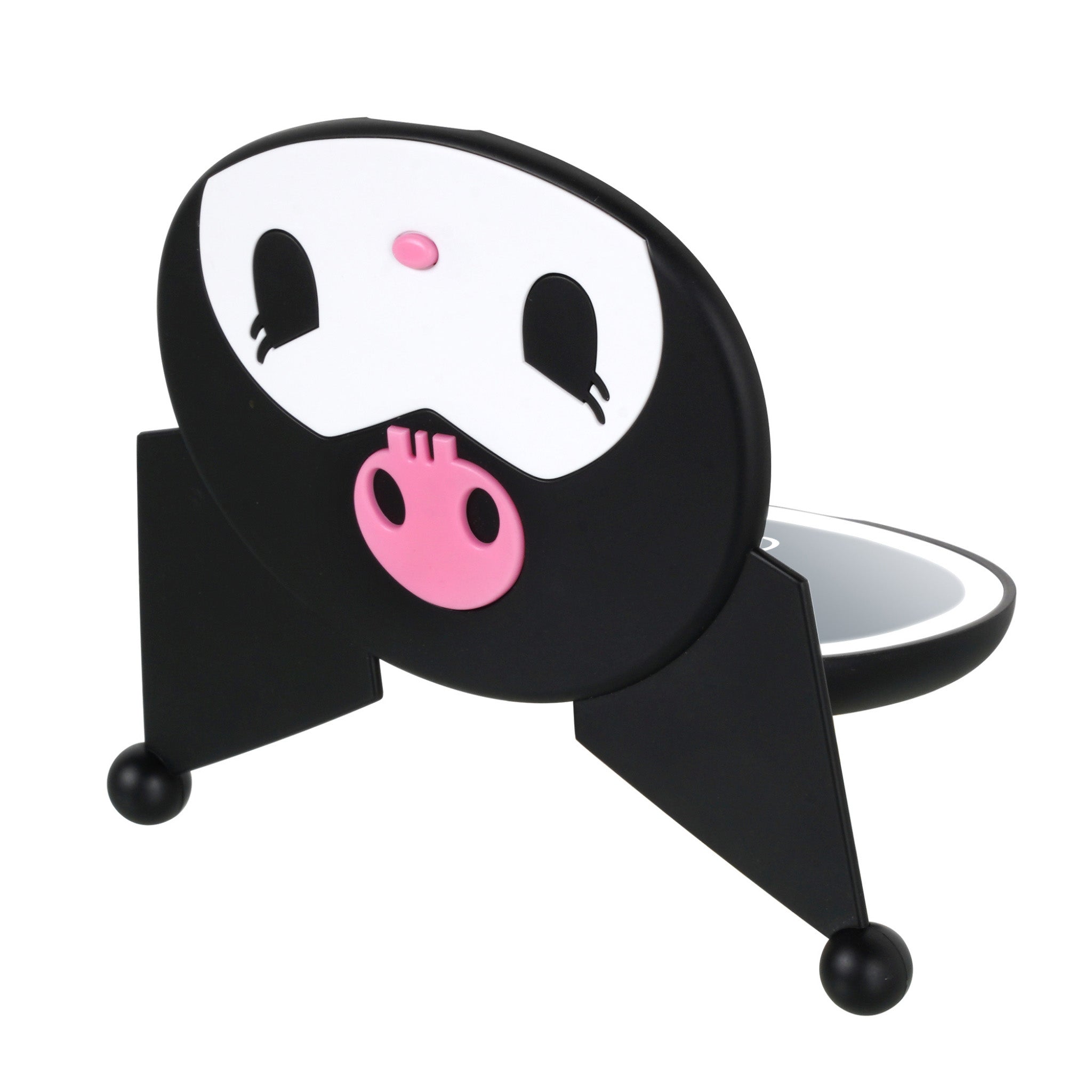 A baddie with her baddie friend! Add a touch of mischief to your touch-ups with the Kuromi LED Compact Mirror. Adorned with a signature hood and skull, this compact boasts double mirrors and built-in LED lights, providing perfect visibility for every touch-up throughout the day.