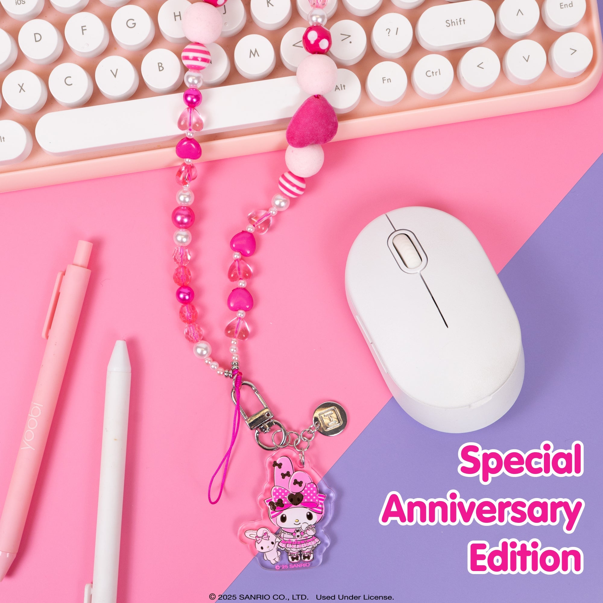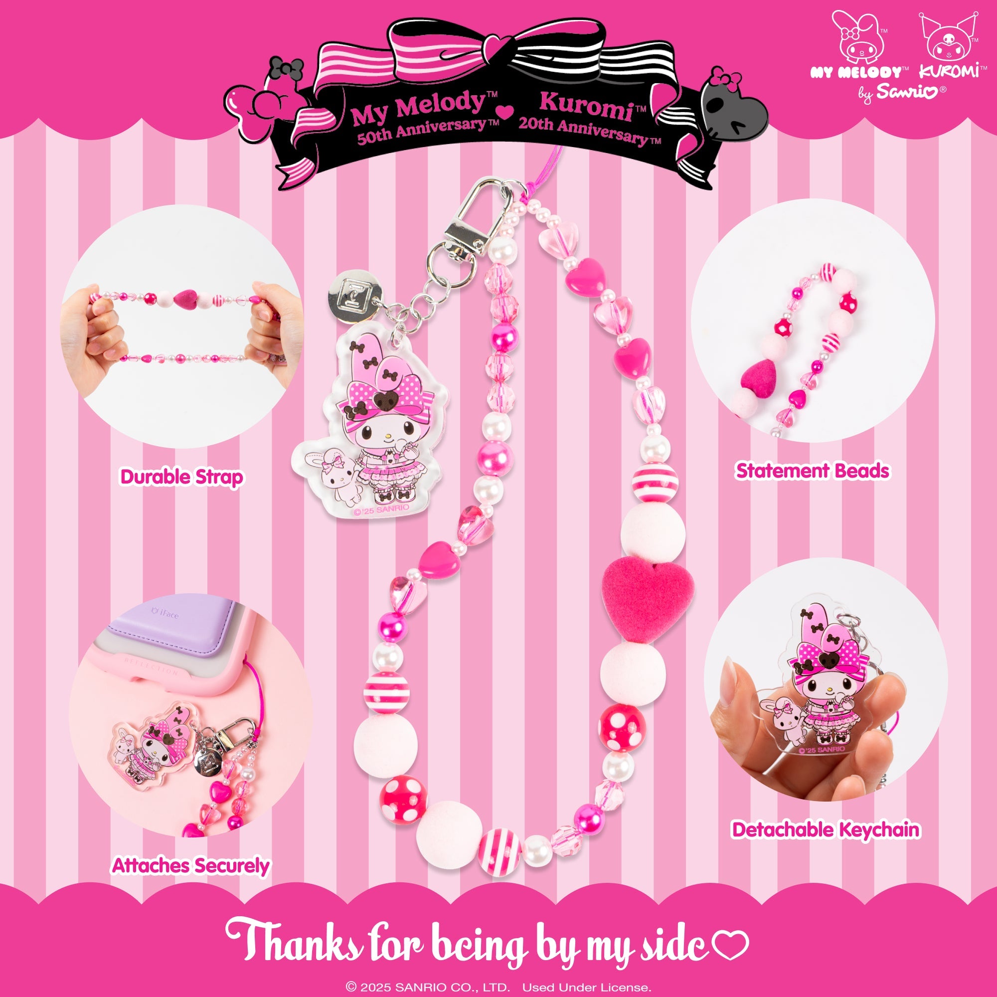 ♡ MY MELODY 50th & KUROMI 20th ANNIVERSARY FRIENDS BEADED CHARM STRAP ♡ 2025 Limited Edition Supercute wristlet for phones, bags, purse, and more with colorful beads and heart-shaped statement beads, plus an exclusive, limited edition detachable keychain charm featuring My Melody’s 50th and Kuromi’s 20th Anniversary celebration style! Only Available Year 2025~!