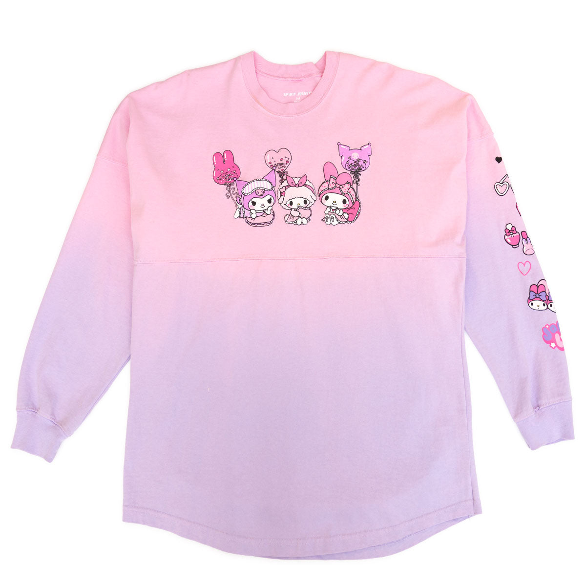 This My Melody & Kuromi JapanLA Spirit Jersey features a pink and purple ombre unisex Spirit Jersey top with puff printing of My Melody, Kuromi, and My Sweet Piano on the front. On the upper back, My Melody and Kuromi’s names are printed using pink and purple super puff. On the lower back is a large graphic of My Melody, Kuromi, and My Sweet Piano having a fun girls night together! The JapanLA Logo is printed on the left sleeve along with some super cute accessories.