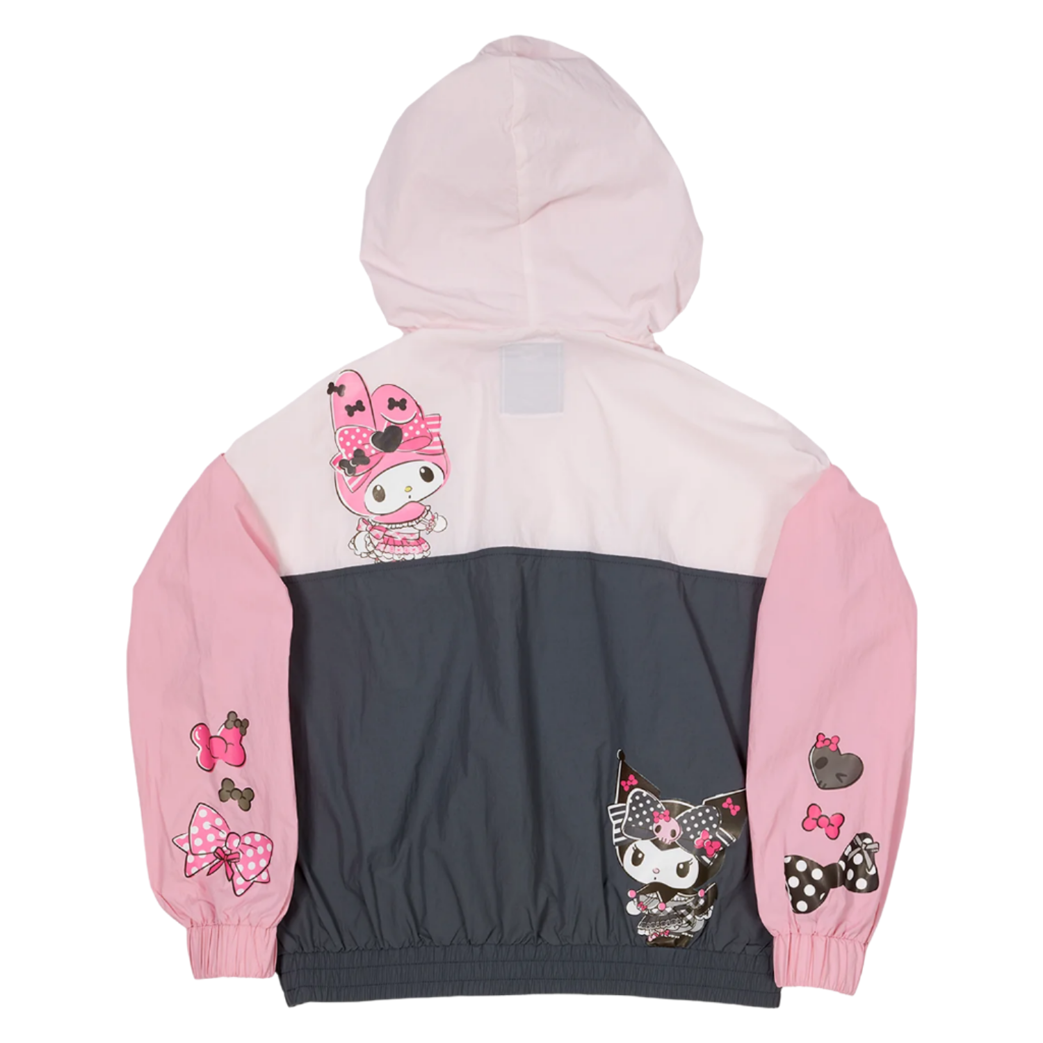 Show off your fav Sanrio characters with this windbreaker jacket! This jacket is half pink, half black, and is inspired by Kuromi and My Melody. On the front, you’ll find Kuromi and My Melody on each side of a pink-and-black heart that’s tied together with ribbon. On the sleeves, you’ll find pink and black bows. Turn the jacket around to find illustrations of My Melody and Kuromi! This jacket is TOO cute, and is a perfect way to show off your love for My Melody and Kuromi!