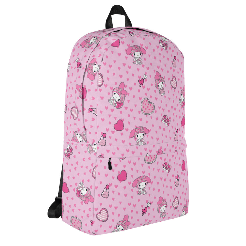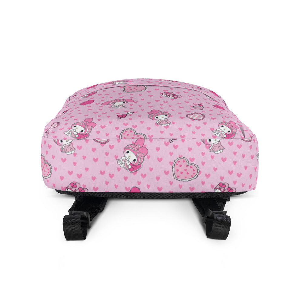 Our #1 sweetheart! My Melody takes the stage for this all-over print backpack. Perfect for class or bringing your work laptop on-the-go, this medium sized backpack is great for everyday use! There’s plenty of room for all your necessities and the sturdy, water-resistant material will protect them from the weather.