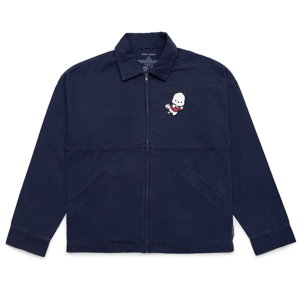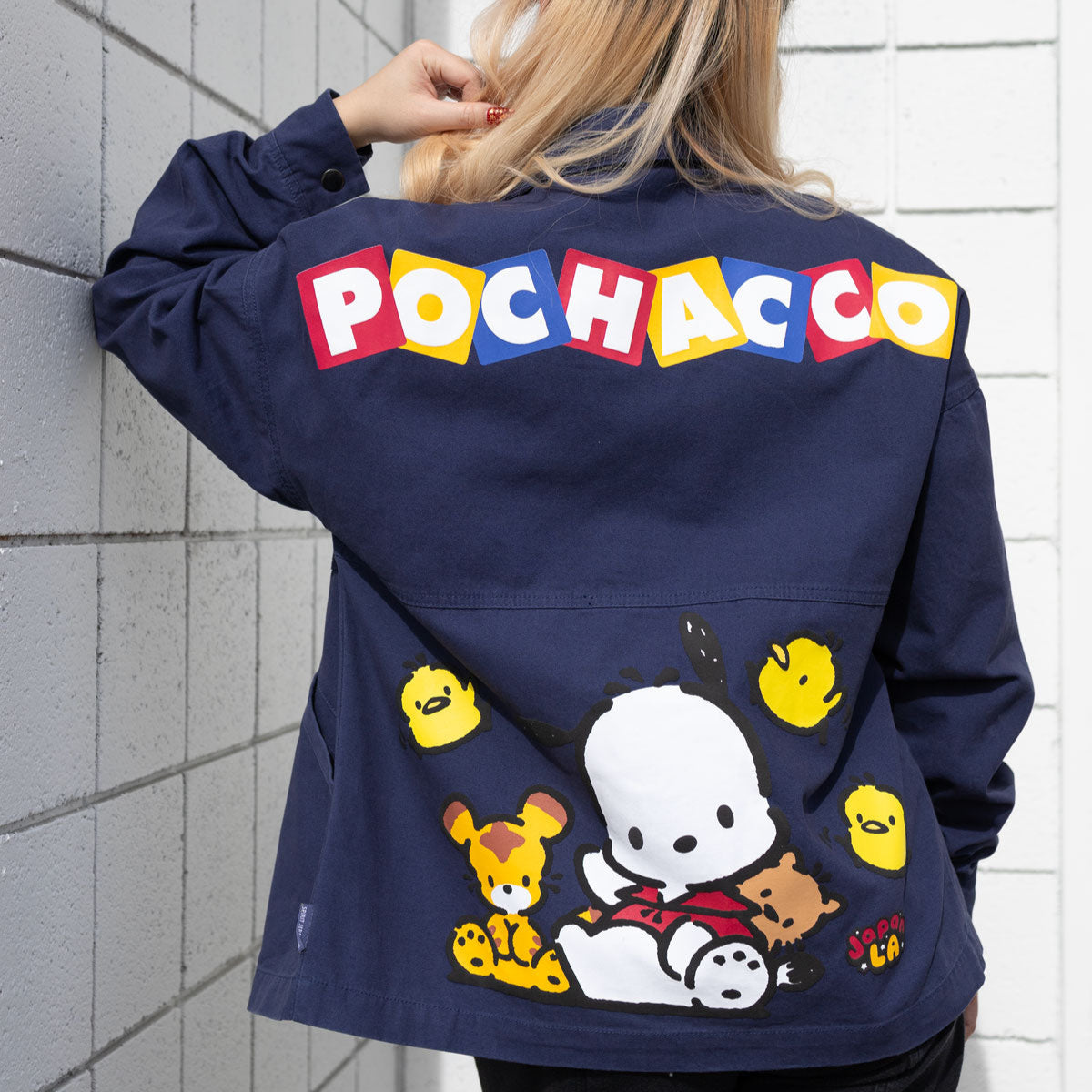 A special collaboration piece between Sanrio, JapanLA, and Spirit Jersey! Look sporty and cute in this Pochacco JapanLA Canvas Jacket, made by our friends at Spirit Jersey! Features sturdy navy canvas fabric and a small puff print of Pochacco leaping on the front. The upper back has Pochacco’s name printed in super puff red, yellow, and blue color block letters. The lower back showcases a large print of Pochacco and his cute friends.