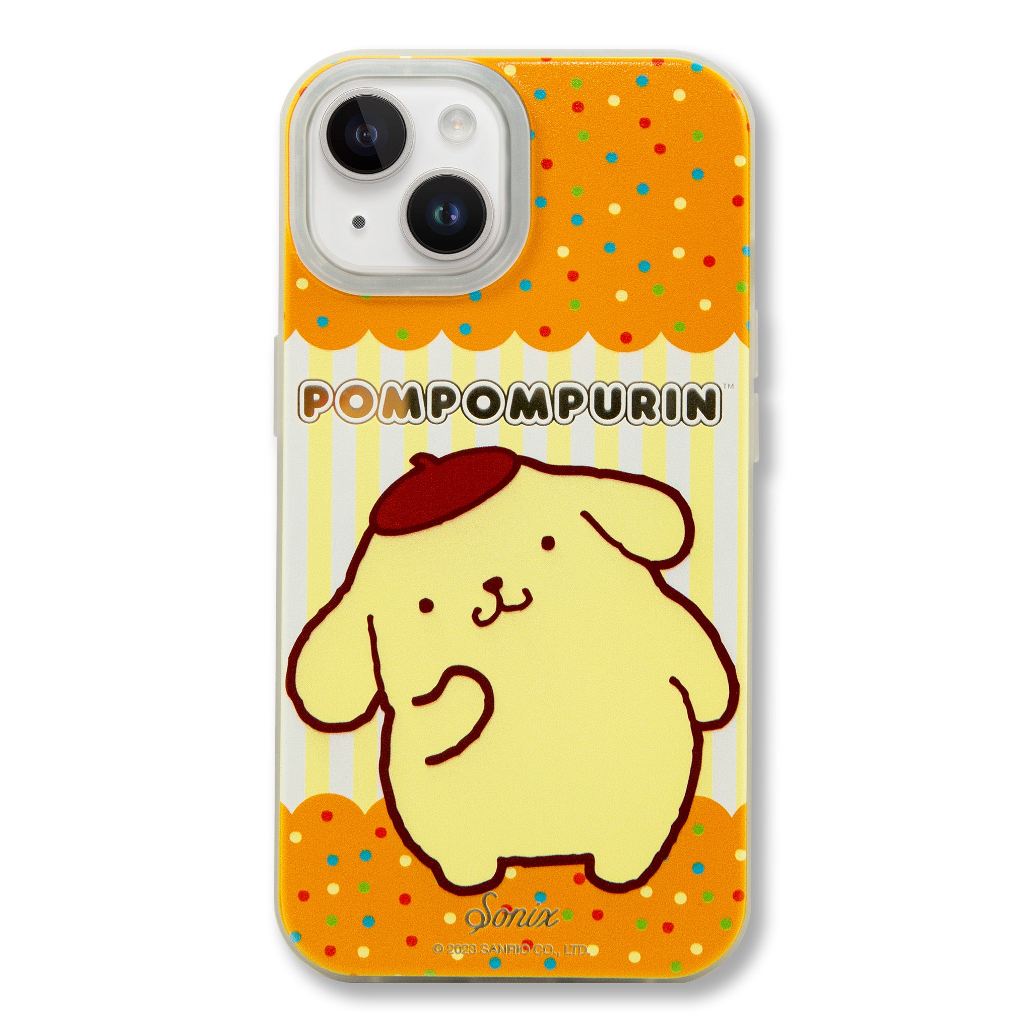 "Let’s go out!" and he’d rather not hear "Stay!" – the sweetest golden retriever around is ready to go on his next adventure! This confetti and stripe print MagSafe® compatible case features Pompompurin™ himself with his signature brown beret.